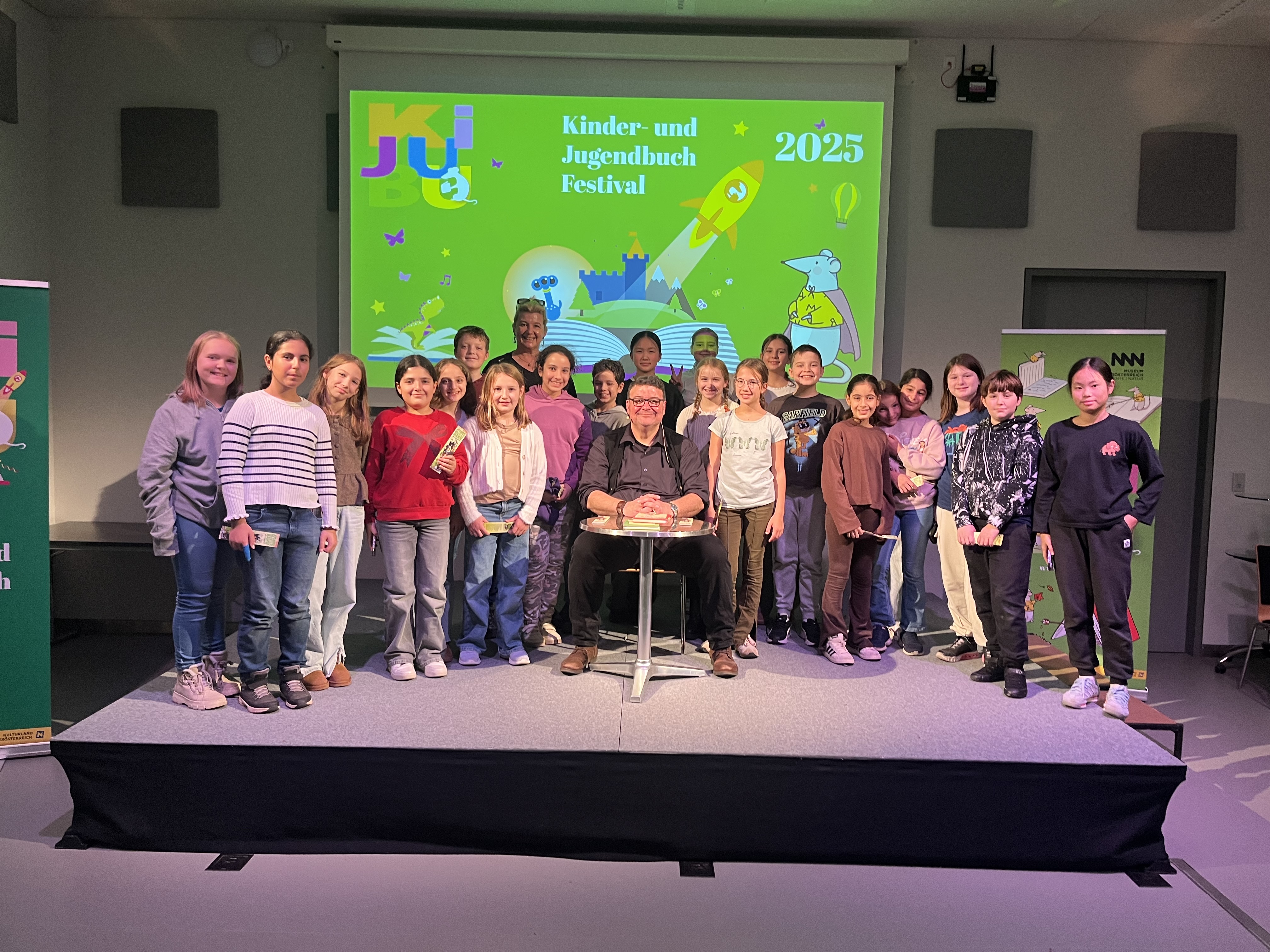 Aufgeregt starteten die Schüler*innen mit ihrer Deutschprofessorin in das Landesmuseum zum KiJUBU Festival. Christoph Mauz las, trällerte, schnaubte, flüsterte, posaunte, sang, … aus seinem Erstlingswerk „1:1 für Tscho“ und alle waren schlichtweg begeistert. Auch auf dem Heimweg war die Lesung unter den Kindern Thema Nummer 1!